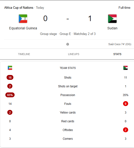 The decisive moment came in the 74th minute in Casablanca when Equatorial Guinea defender Saul Coco scored an unfortunate own goal. The Torino centre-back saw the ball ricochet off him and into the net as teammate Luis Asue tried to clear a Sudan free-kick.